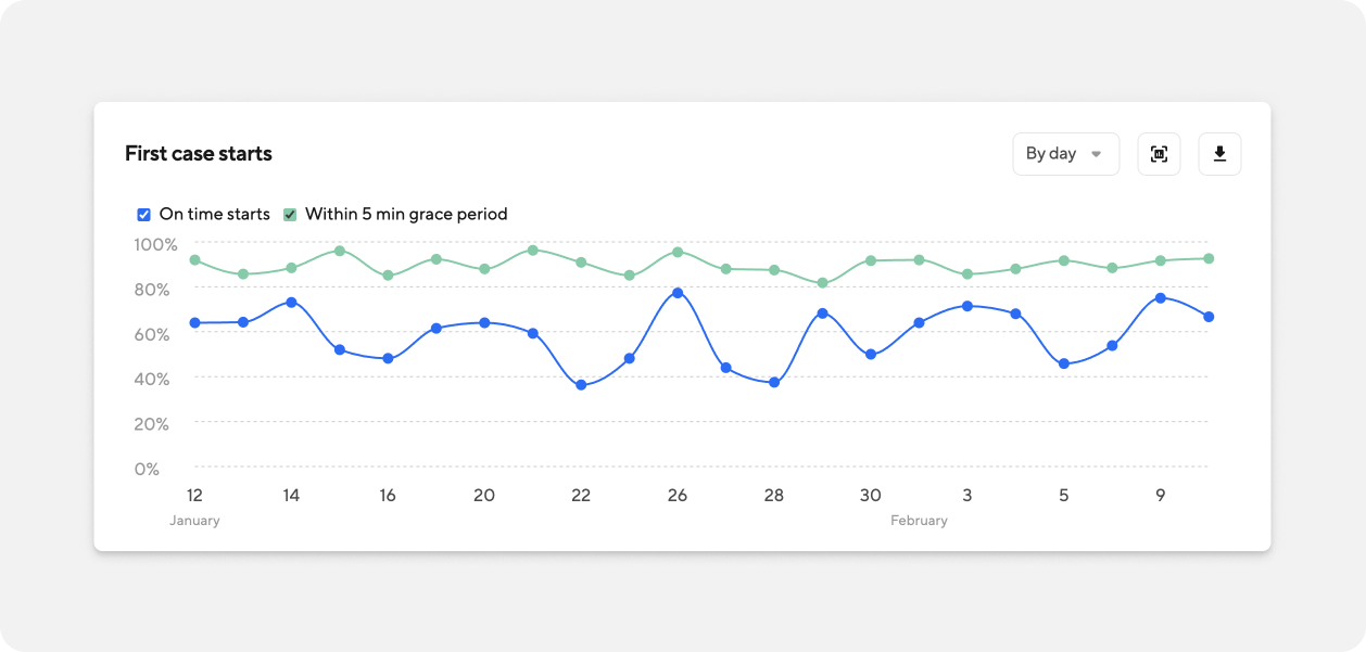 FCOTS is an industry standard metric that helps hospitals understand how well they are able to set the day up for success by starting their first cases on schedule. On its own, FCOTS gives an overview of how often rooms start on-time.