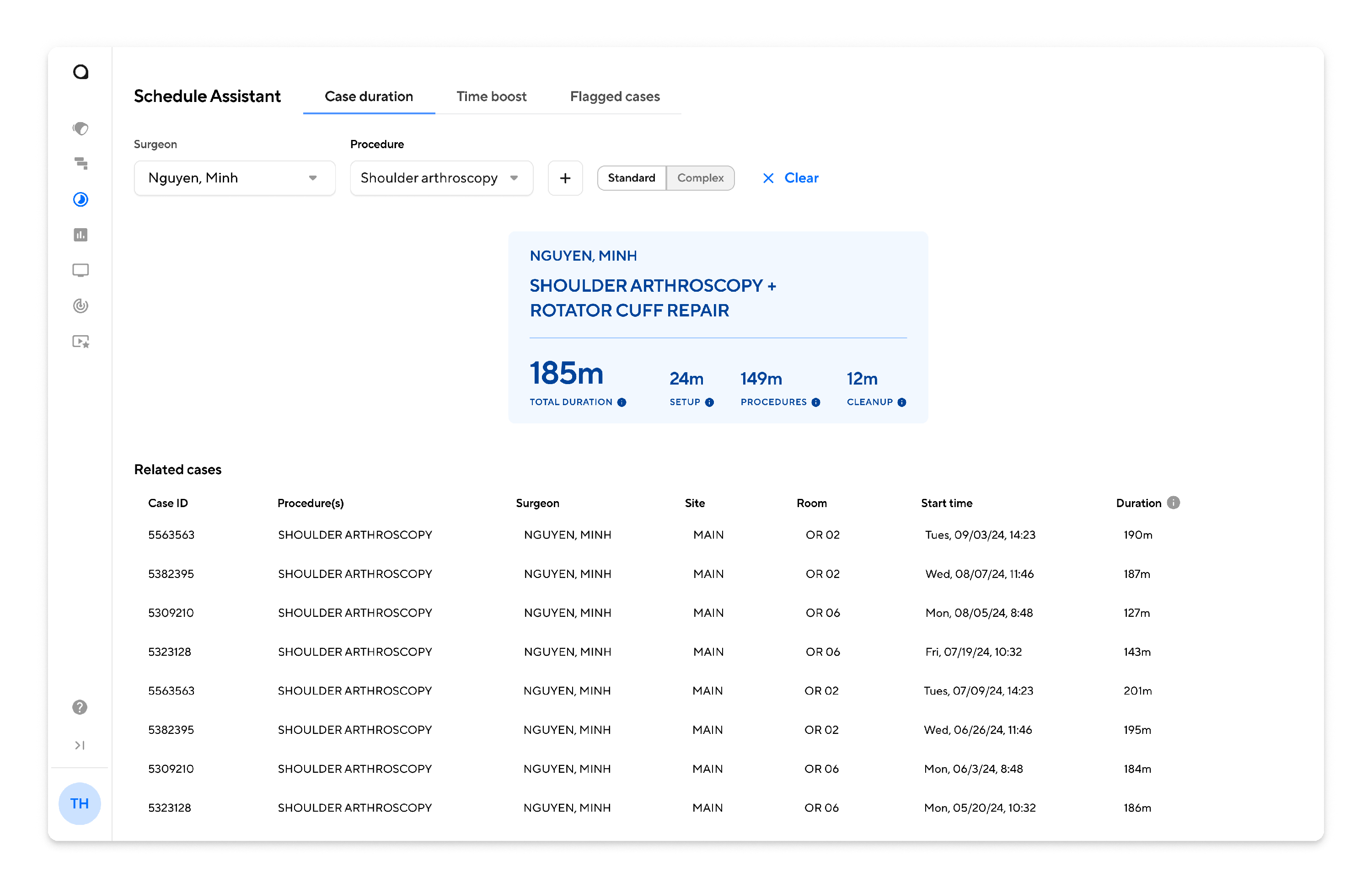 Apella's Case Duration tool is designed to provide Schedulers with precise procedure and turnover duration for each surgeon and case combination. Apella uses predictive AI models, Apella-detected data, and historical EHR data to predict case durations with greater accuracy.
