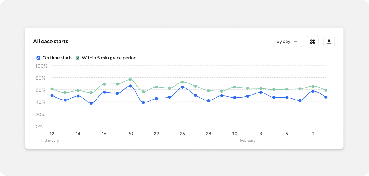 Apella On Time Starts let's you to track on-time performance for all cases, not just first cases. This expanded tracking allows you to measure performance beyond the first case of the day, and filter by service line, room, or procedure to better understand what is contributing to late starts.