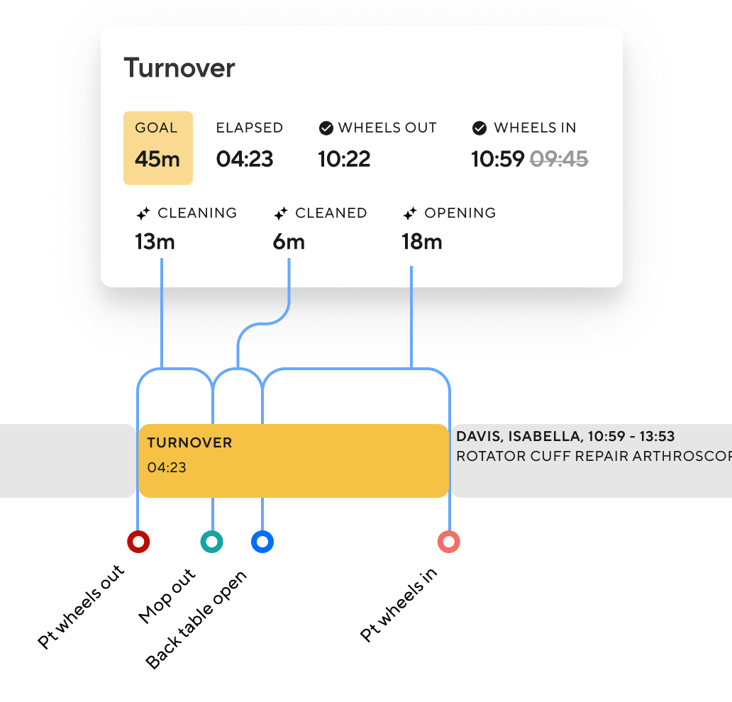 - Apella-detected events: Real-time OR signals captured through Apella's ambient video, such as back table open, patient wheeled in, or patient draped. These signals help Apella learn surgeon- and procedure-specific trends for both cases and turnovers, and the models improve their understanding over time.