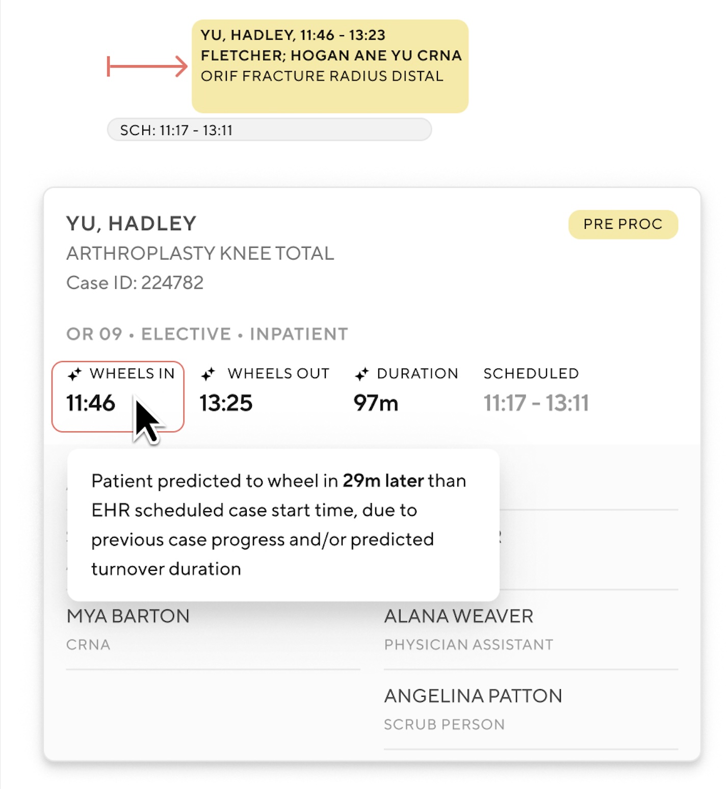To learn why a case is predicted to start or end at a different time than the EHR schedule: hover over or click the case to view details, and hover over the forecasted wheels in or wheels out times.