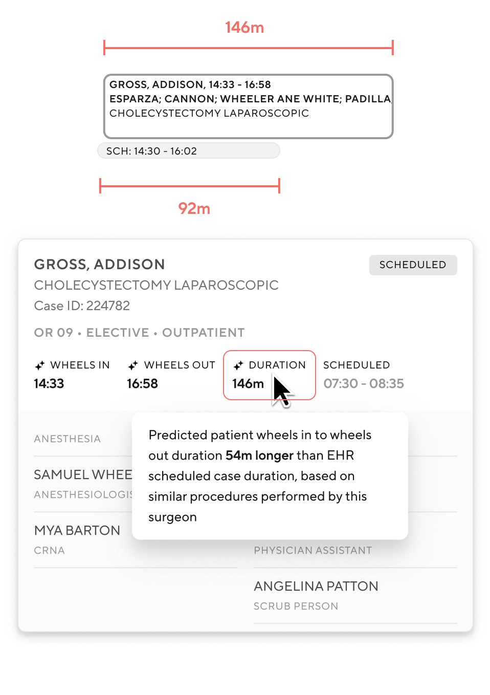 To learn why a case is predicted to run longer or shorter than scheduled in your EHR, hover over or click into the case for details. The forecast reflects what Apella has learned about similar procedures in comparable circumstances.