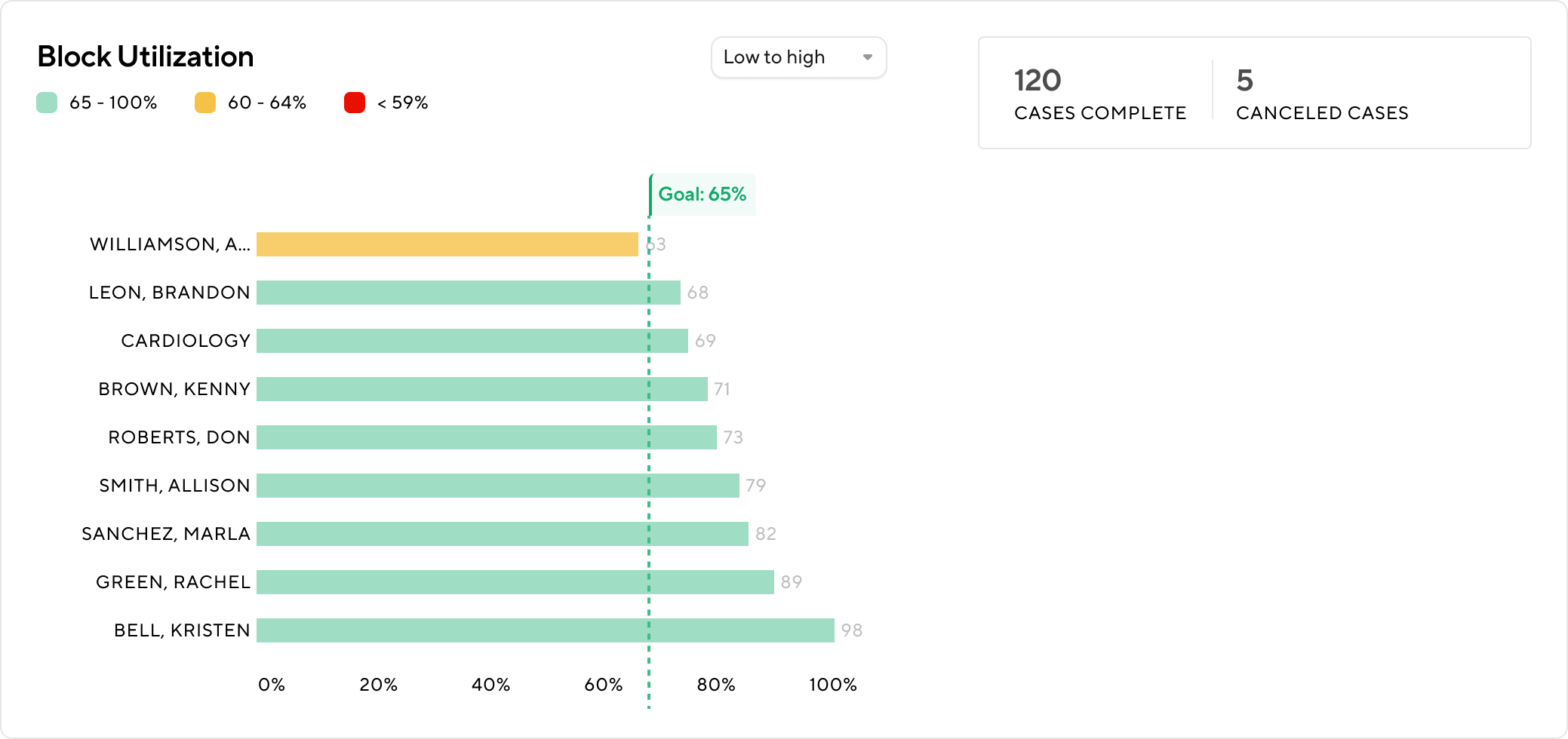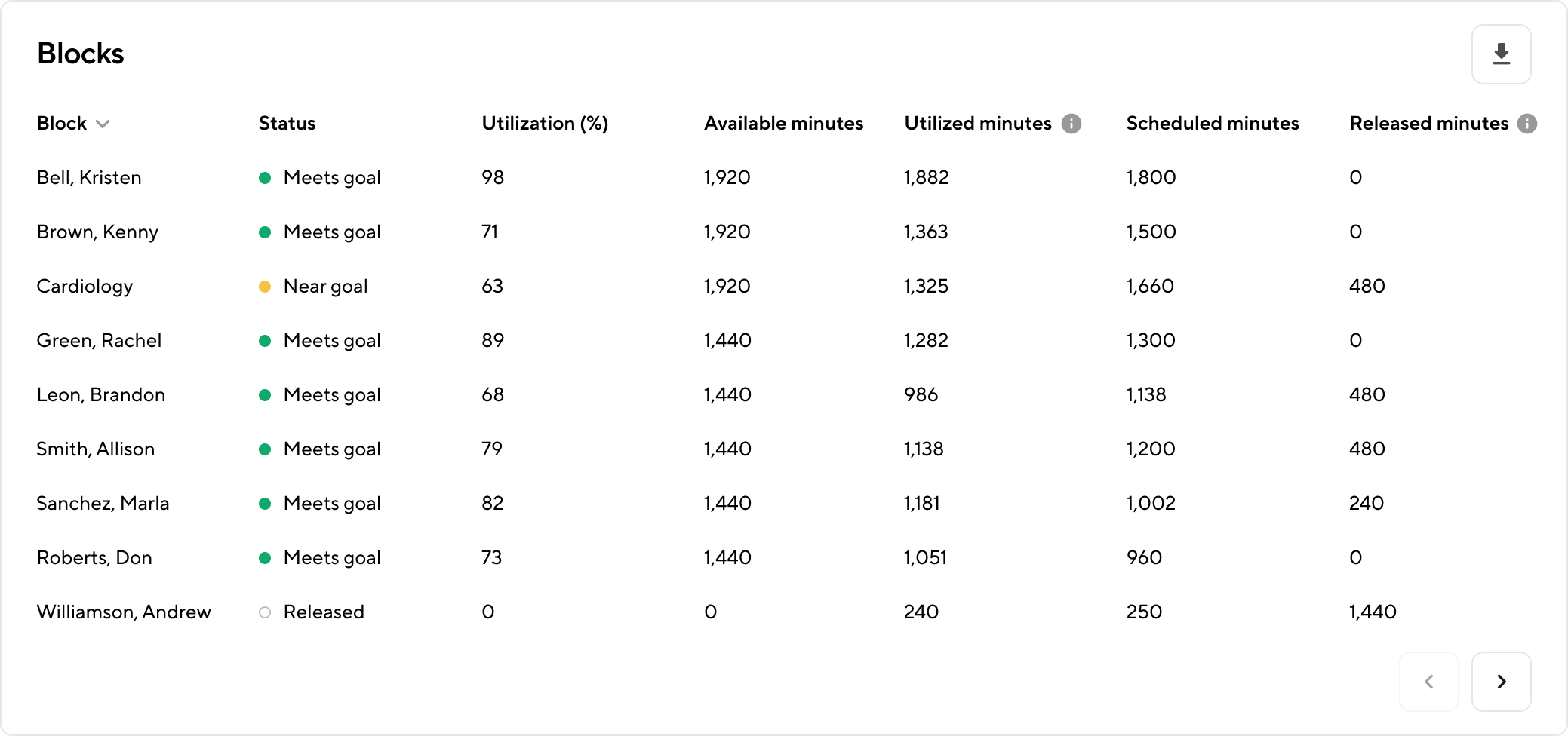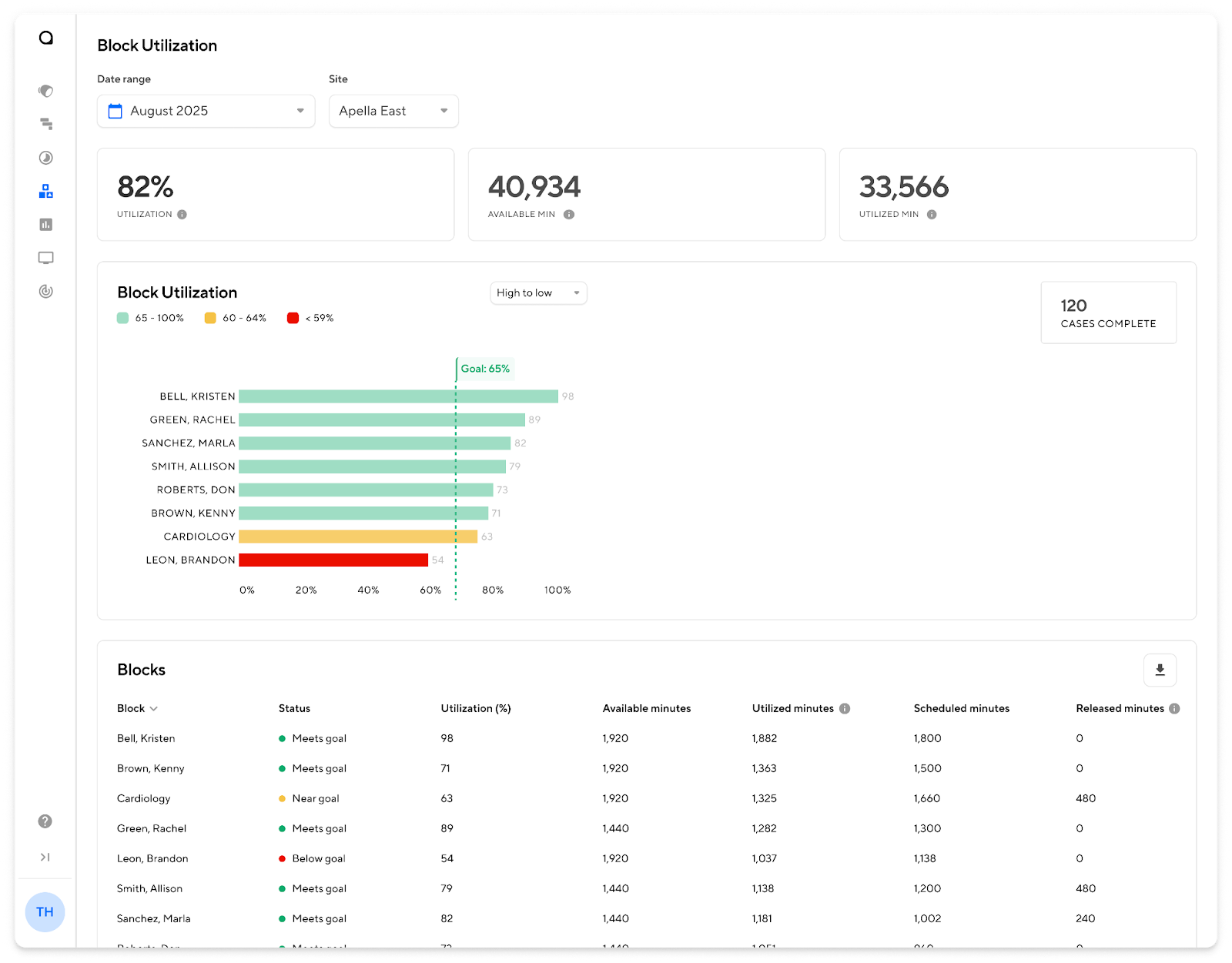 - Overall block utilization: Utilized minutes divided by available minutes