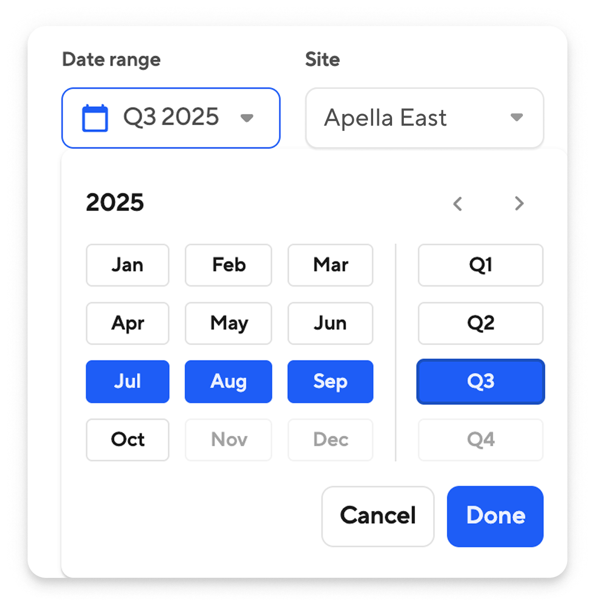 - Select a date range: You can select a range up to three months, including the current in-progress month. Predefined quarterly ranges are also available for quick selection.