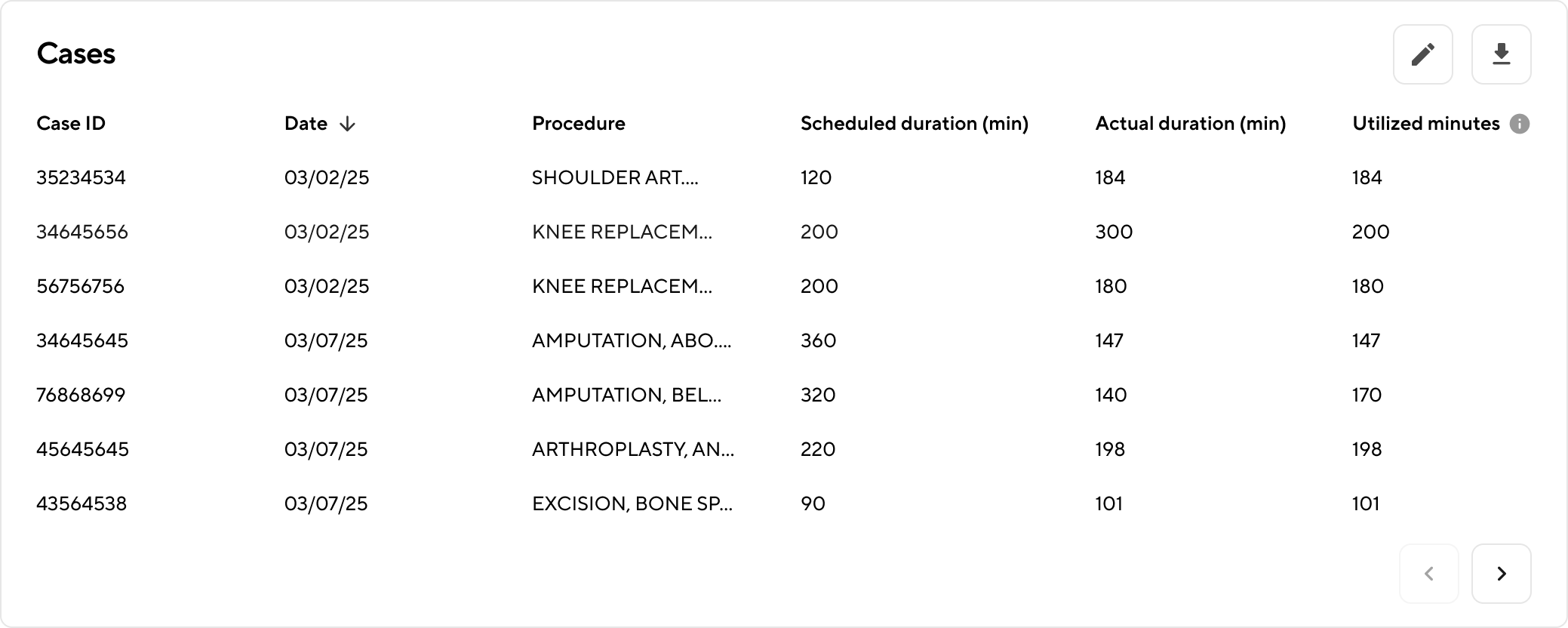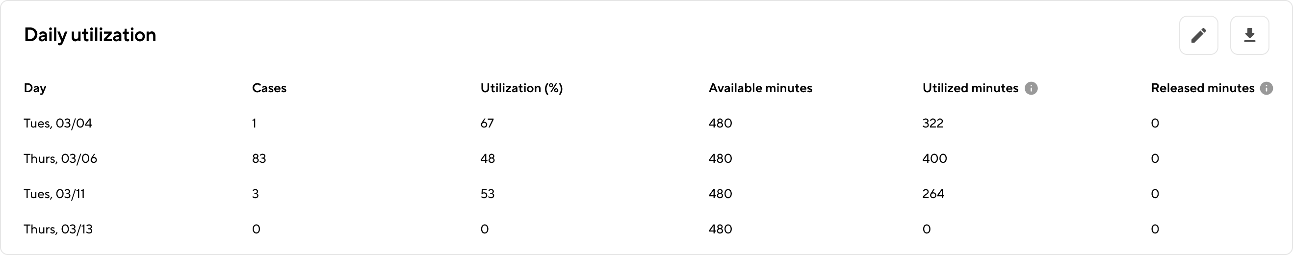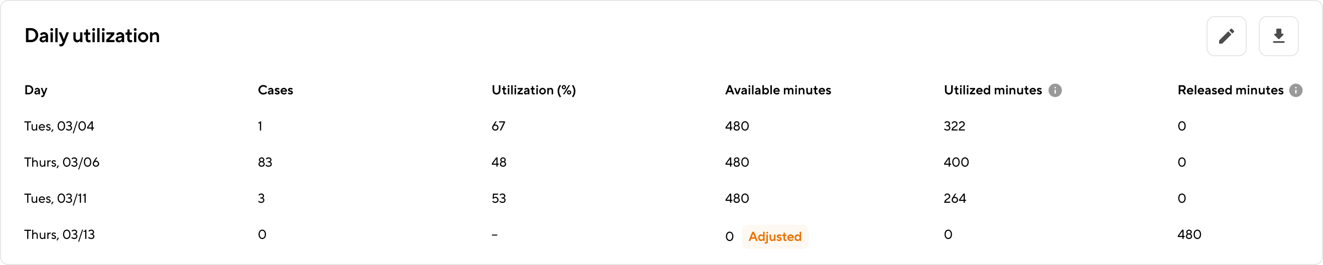 - Utilized minutes: Total in-block minutes utilized within the selected time range. Actual case duration plus a standard 30m turnover time is used.