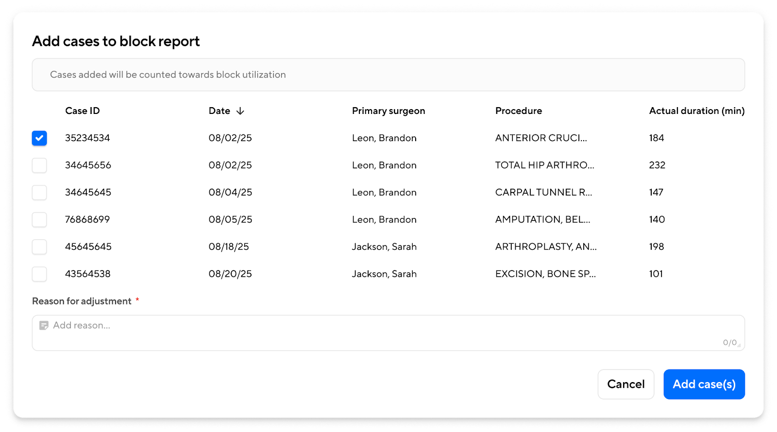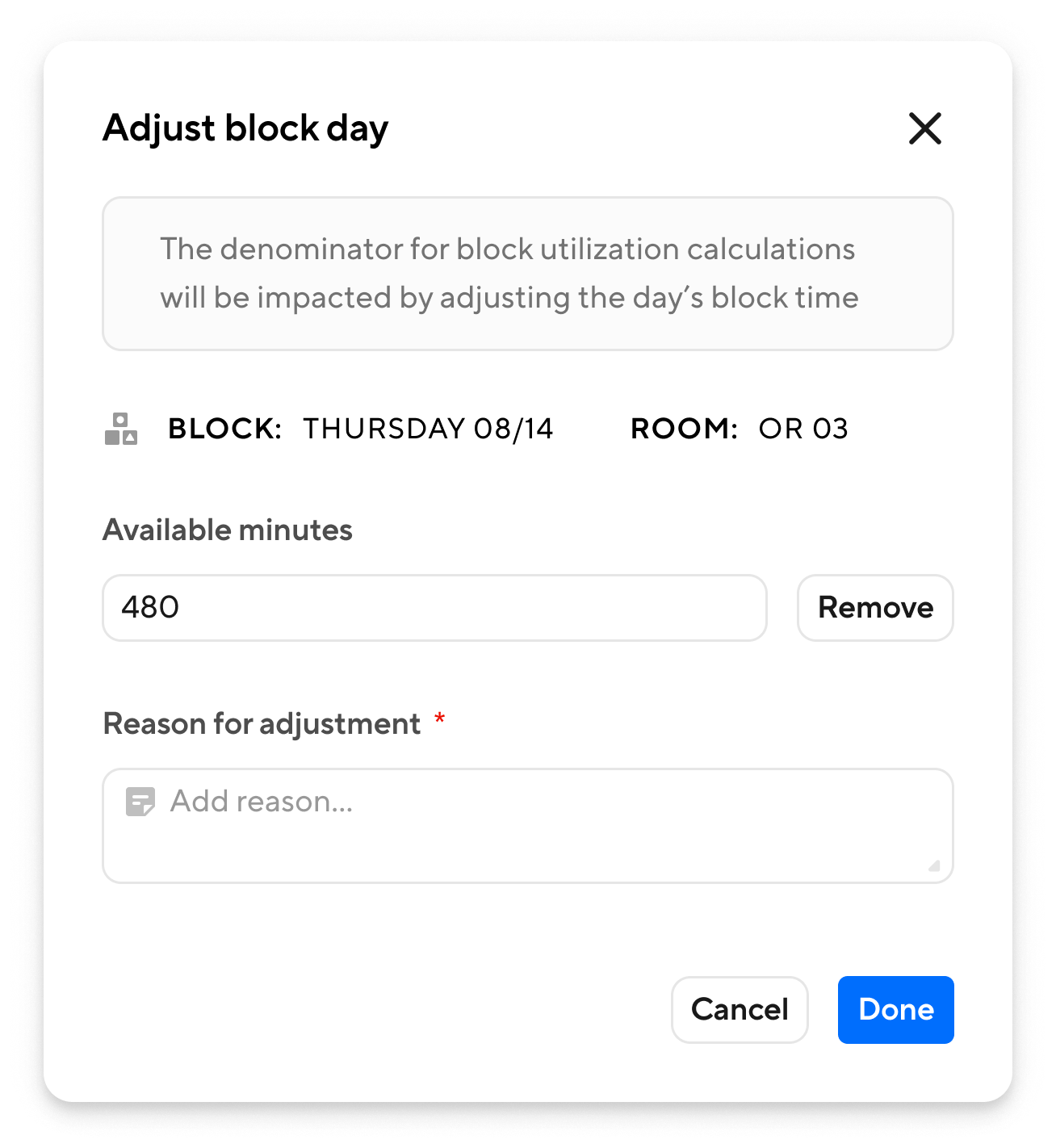 You can make block-specific adjustments to ensure that utilization data accurately reflects real-world circumstances. This is useful when accounting for factors such as late releases, schedule changes, or cancellations that are not captured automatically in the source data. Adjustments help maintain data accuracy and transparency for performance reviews and reporting.