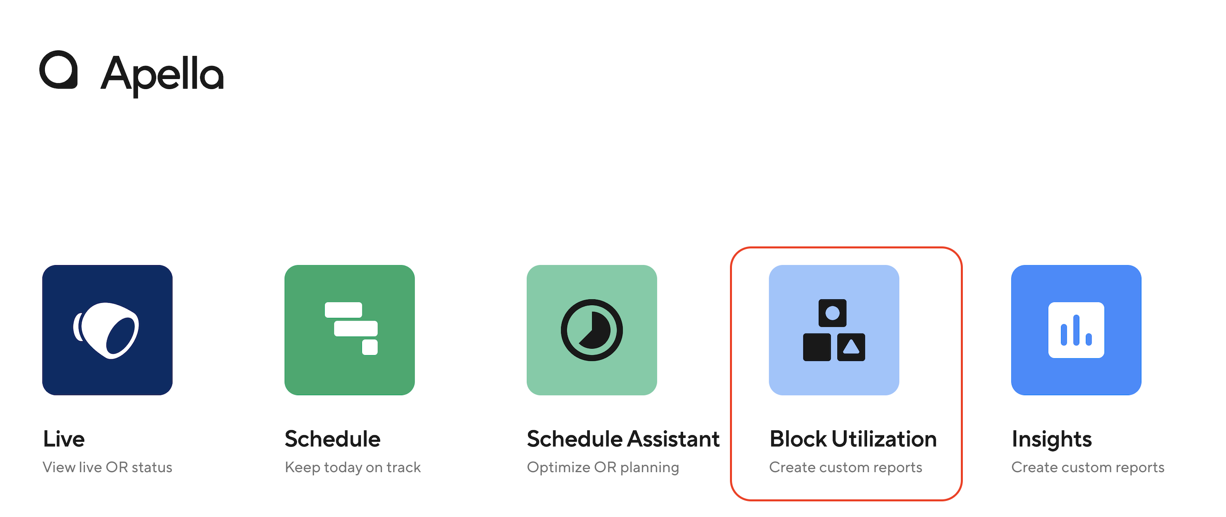 From the Apella homepage, select the Block Utilization icon to access the tool. If you do not see the Block Utilization icon on the home page, it means you do not have access.