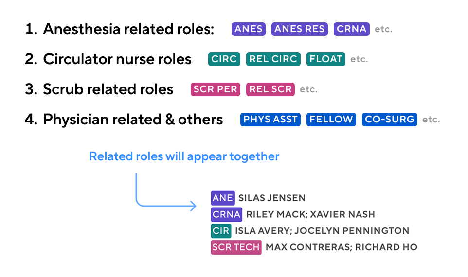 - Different staff roles are color-coded and grouped by role for easy visual reference.