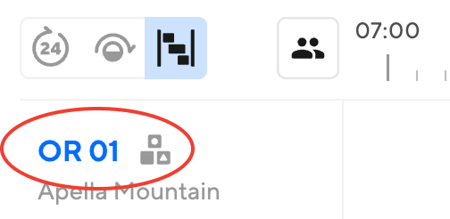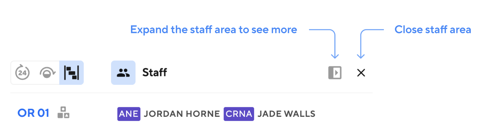 In Schedule view, each OR room appears as a row. For each room, you will see the staff assigned to the current case or the next case (if the room is in turnover).